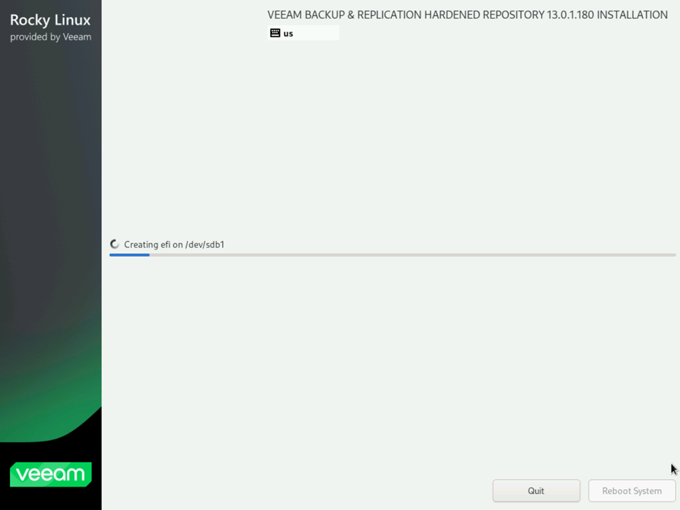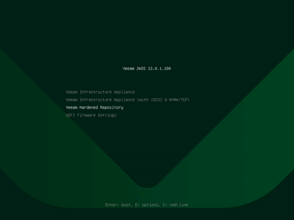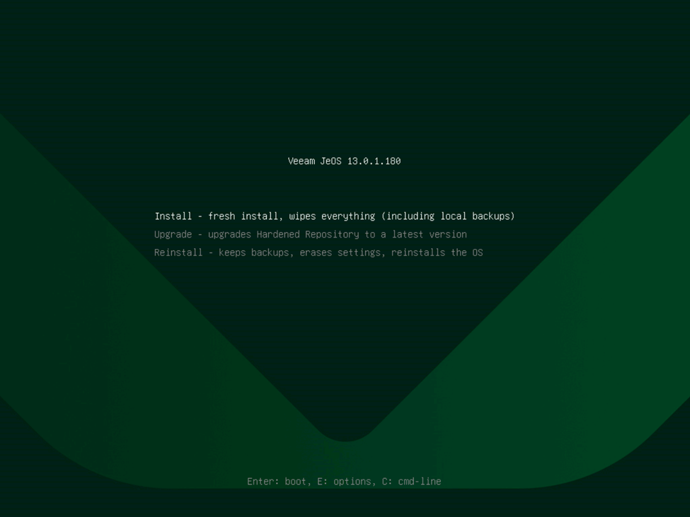 First of all, download the Veeam VIA (Veeam Infrastructure Appliance) ISO. This is the lightweight ISO that contains the JeOS (Just-enough Operating System) used for Veeam components including the VHR, but also for other components such as standard linux repositories, proxy servers, etc. This is NOT the full install of VBR, but is instead only the required components to create these complementary appliances. That said, this also complements the linux-based Veeam Software Appliance (VSA) quite well for a linux-only deployment of VBR. Burn the ISO to a thumb drive (remembering to use DD Mode if using RUFUS) or mount the ISO to the virtual console of your physical server. I do recommend in most cases using a thumb drive as I’ve found that sometimes mounting virtually causes for slow boot times and have seen some timeouts if you’re performing this process over a VPN. Once booted, you’ll be presented with this new JeOS boot loader, so of course be sure to select the “Veeam Hardened Repository”. In our case, this is a fresh install, so select as such. I did want to note however that there is an option to repair an existing VHR just like there was on v2, but also there is an “Upgrade” option as well which is intended to upgrade old versions of the VHR, including the v2 appliance. While the v2 appliance did receive an update making it compatible with VBR v13, it doesn’t take advantage of the Veeam-managed OS updates the the v13 VIA/VHR performs. Wait for the OS to boot.