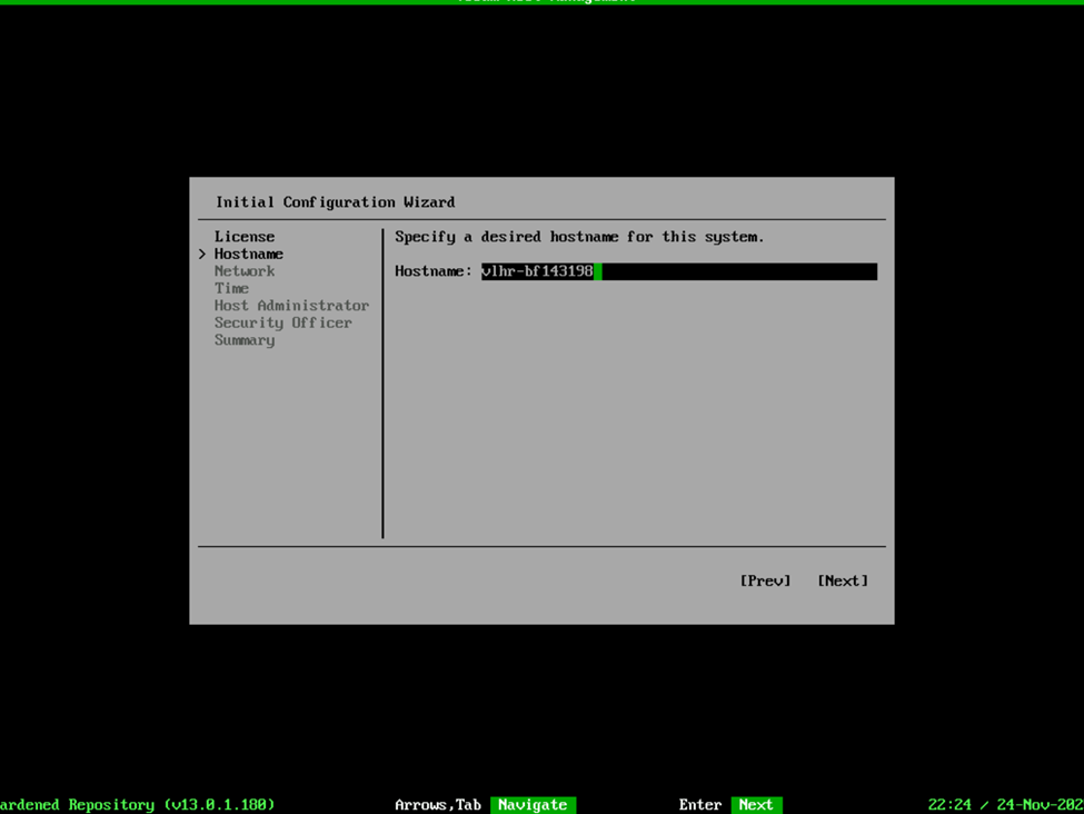 After the OS reboots, it’ll start the appropriate host management services where you will be prompted to accept the licensing agreements and now you will begin configuring the appliance starting with the Hostname, Networking, etc.