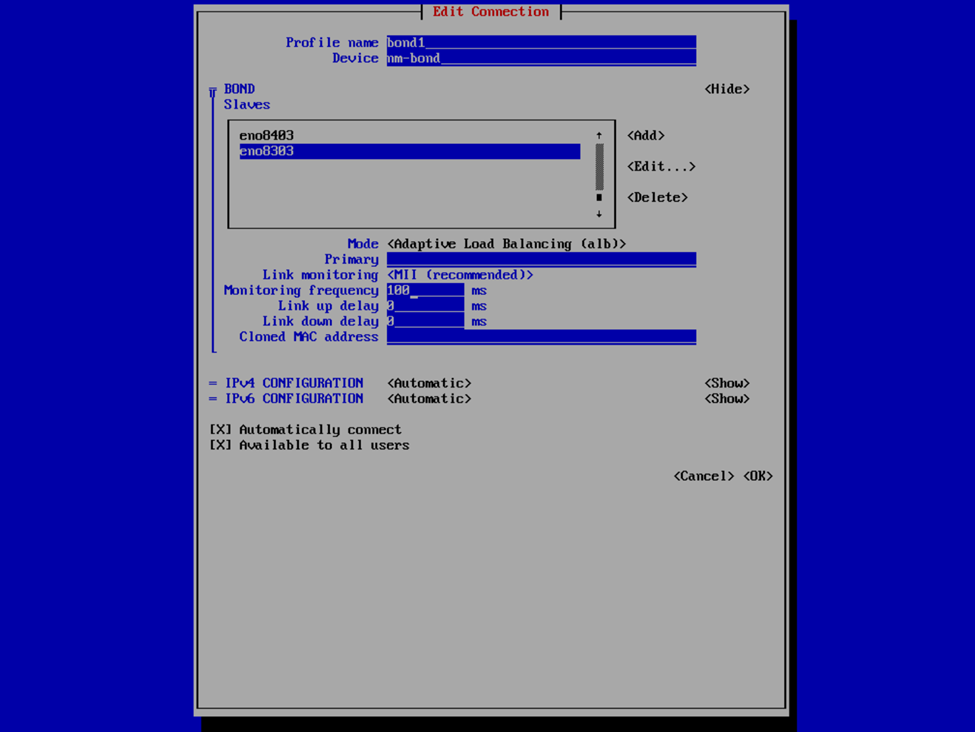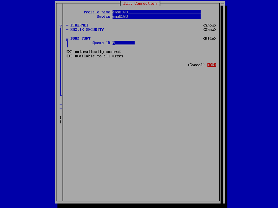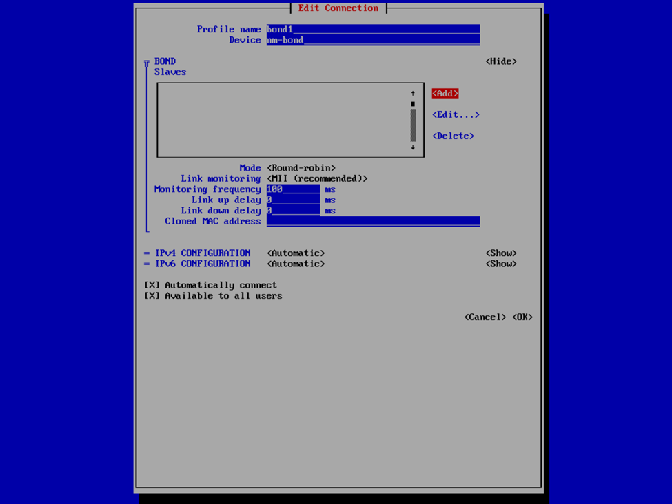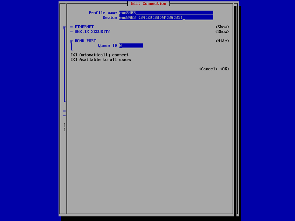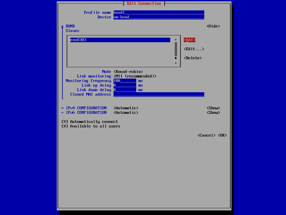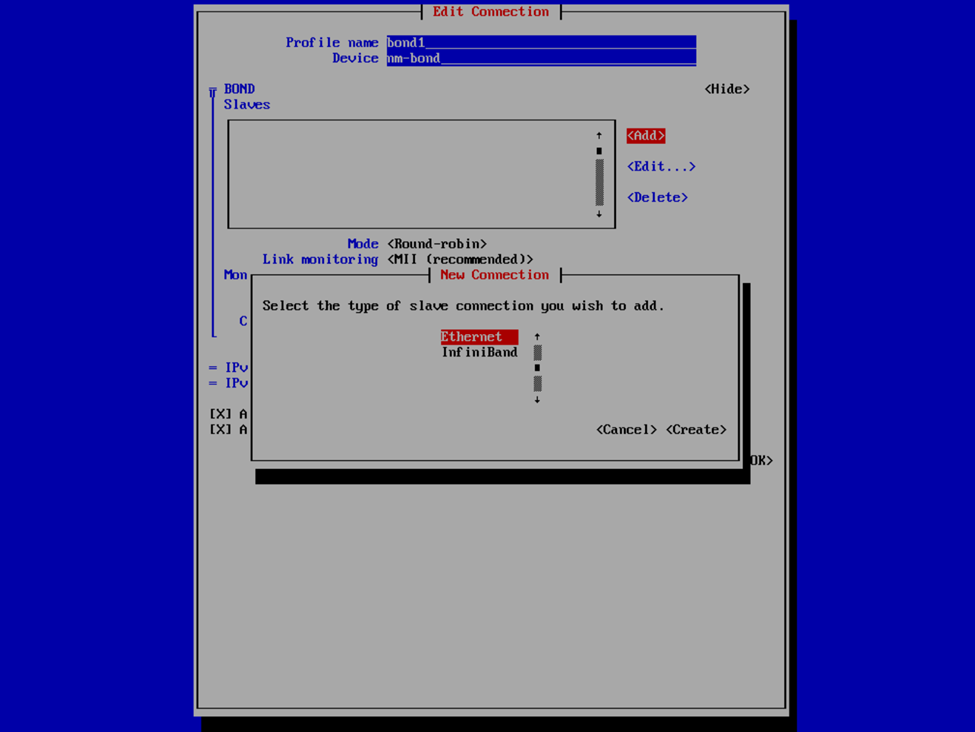 If you’re familiar with this process, it’s not all this dissimilar as with the v2 VHR ISO, except just slightly less user friendly. Provide a profile and device name for your bond interface, or accept what it provided, and then select Add > Ethernet to specify the interfaces that are to be a member of the bond. This is where we’re going to provide the the interface and device name and MAC address that we have previously noted. Select OK and then repeat for any additional interfaces.