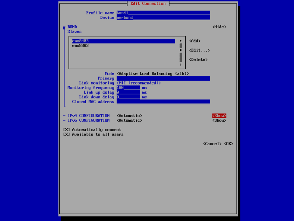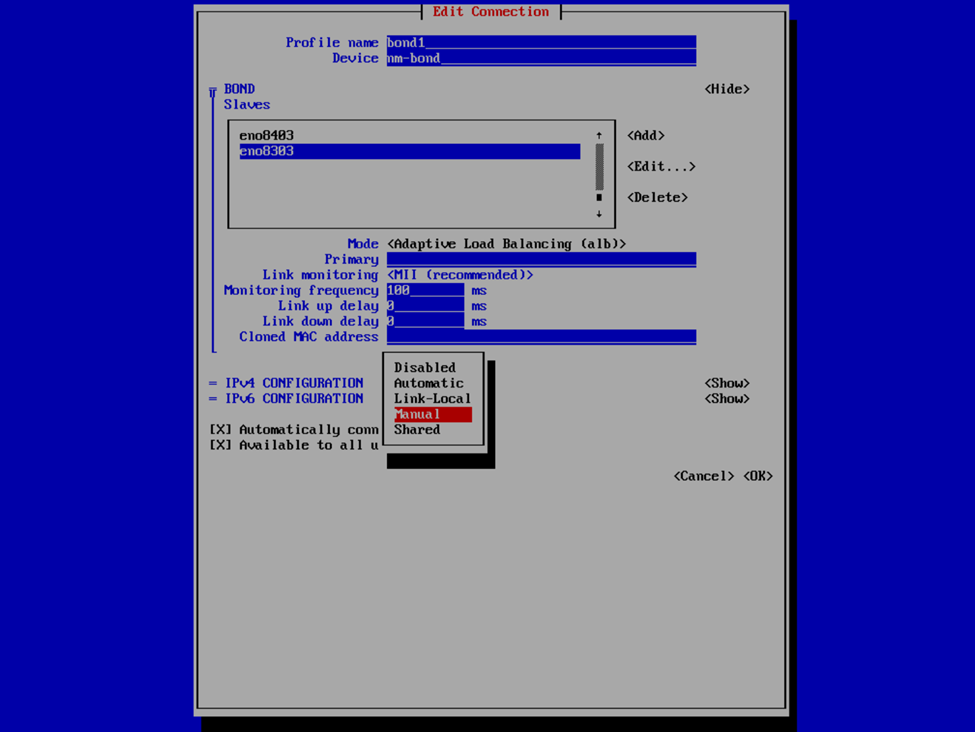 And oh the networking….this is where things got a bit more complex for me. On the v2 ISO deployment, you were able to list the network interfaces and select them. This is still the case, unless you are planning to create a network bond. I’ll explain, but for the moment, you’re going to want to write down the name and MAC address of each network interface you plan on adding to the bond, because it’s not so “point and click” this time. In this case, armed with the network interface information, we’re going to select the Advanced option and in it, we’re going to Select Add > Bond > Create.