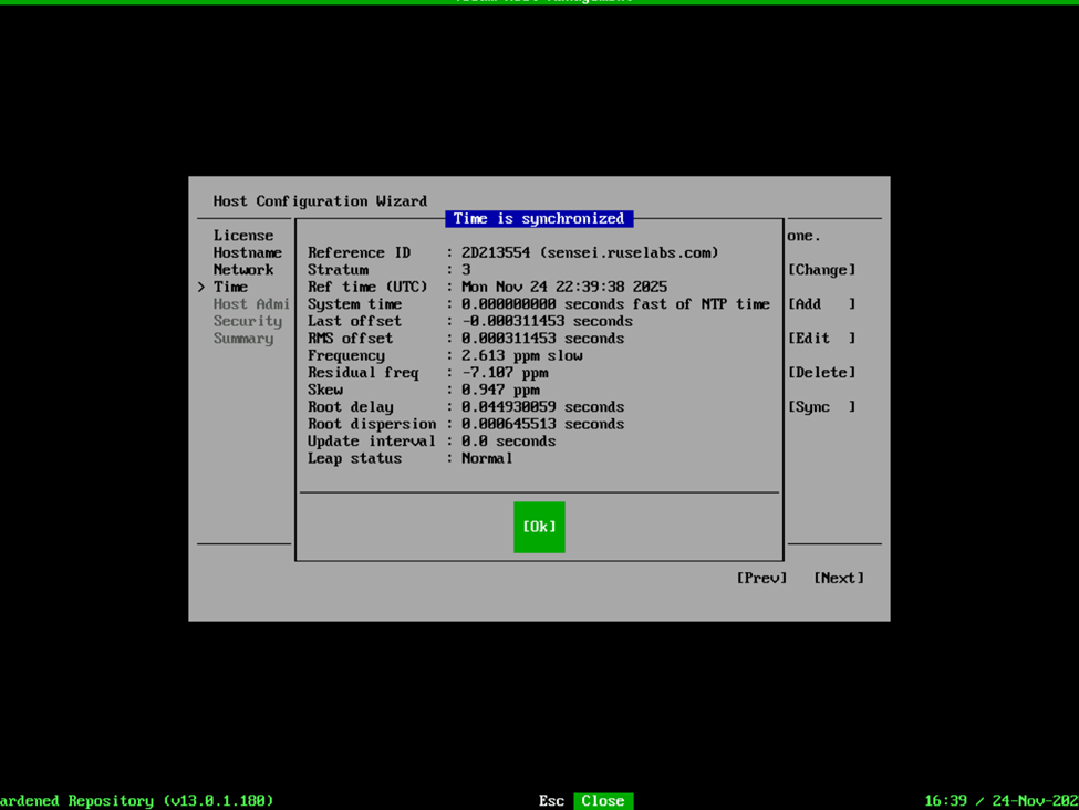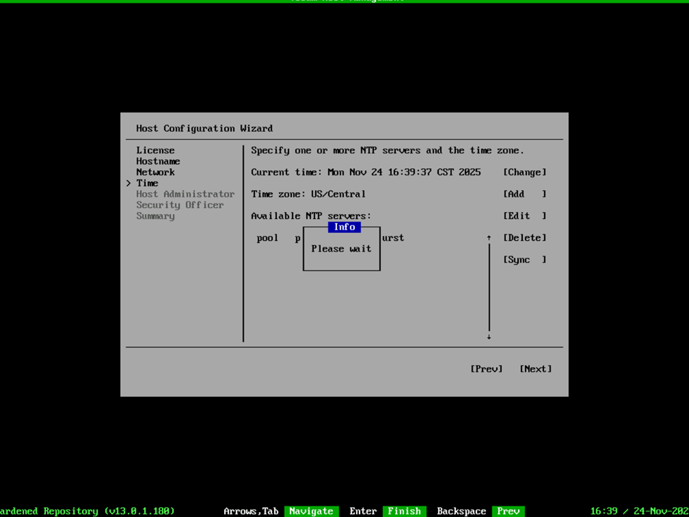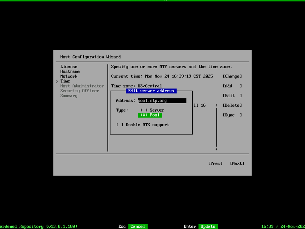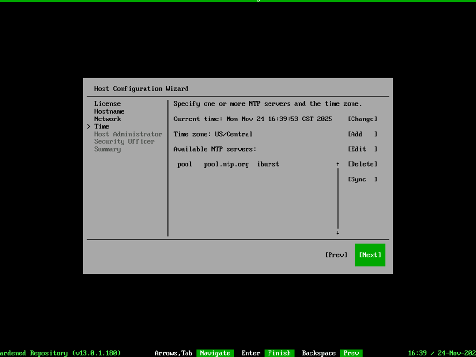 Once we’re over that hurdle, we can configure the Time settings such as the NTP server, Time zone, etc. In my case, I like to use pool.ntp.org so I selected Change, provided the server URL and noted that this was a pool. I also selected edit so that I could change my Time zone to US/Central, and then selected Sync to validate my settings were working properly. Then Next to move on to the Host Administrator.