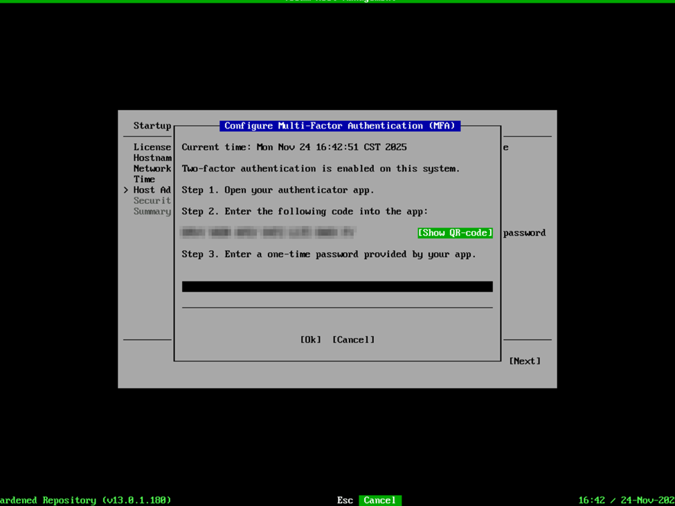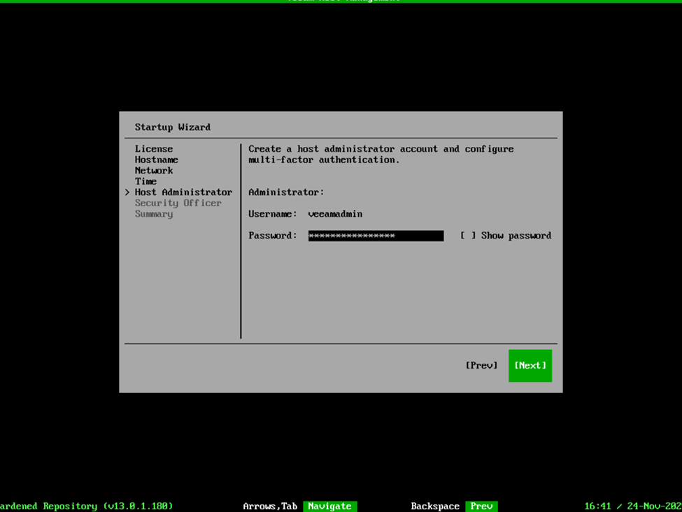Next up, create a password for the default “veeamadmin” account. Note that this still requires a DISA STIG compliant password. After providing the password, you will need to enroll in MFA.