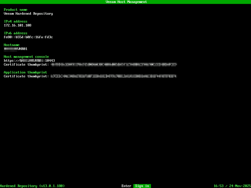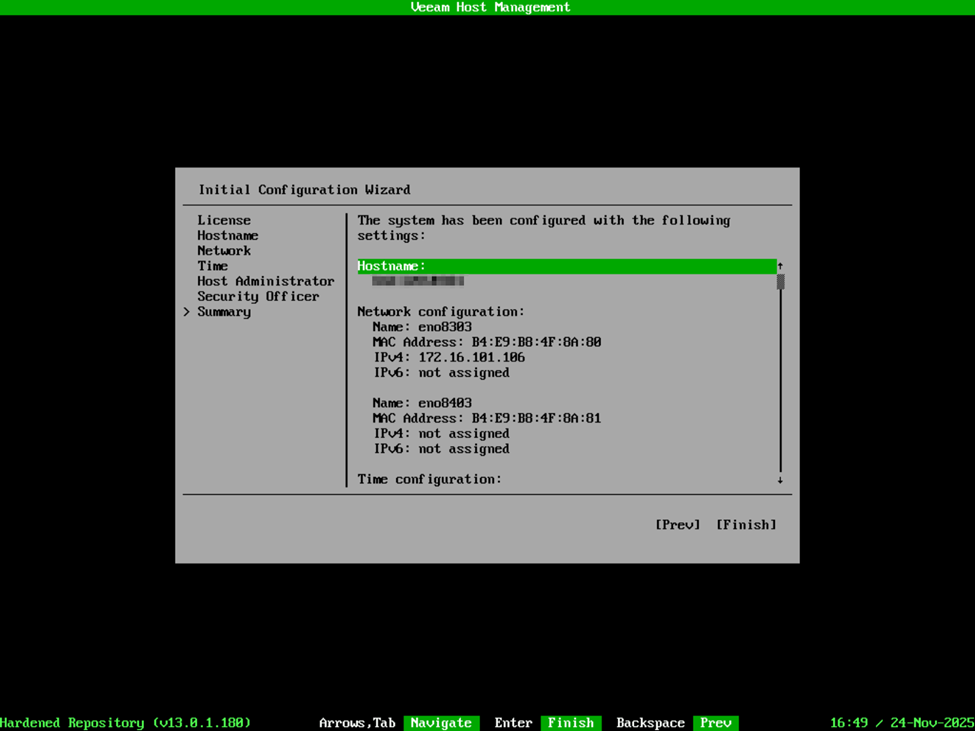 Security Officer is a new role that Veeam added with VBR v13. This function performs a few things – one is that it enacts the four-eyes type of verification for changes to the VBR environment. For instance, certain changes to the appliance configuration, or to the VBR deployment as a whole will require verification by the Security Officer account if deployed. In the case of the VSA, the Security Officer role is option but cannot be added after the deployment has been completed. I will say, don’t get married to your password for this account. This is an initial password to complete the deployment/configuration of the VHR, but after the VHR is deployed, the first time you log into the appliance management interface, it will require a password change and MFA enrollment. At this time, the password you’re supplying is simply for the initial setup and configuration, but it does require the password to also be DISA STIG compliant. After providing a password, confirm your configuration is correct on the summary page and select Finish. At this point, it’s going to remind you that you will need to log into the appliance management web interface with the Security Officer account to activate the login, and then you will see the appliance configure itself and activate the required services. After everything is complete, you’ll be presented with the Host Management interface which summarizes the Product Name/Role of the appliance, IP addresses, and certificate keys along with the host URL for accessing the host management web interface.