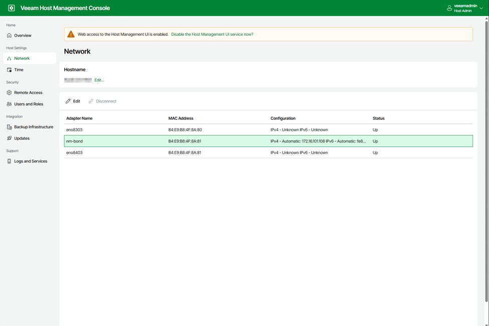 When visting the Host Management Web interface at the specified URL, https://IPADDRESS:10443, you can log in with the veeamadmin account to view the properties of the appliance. In my case, when selecting the Network tab, I’m presented with the physical network interfaces as well as the network bond. Some changes can be made here such as the IP address, etc, but note that you cannot add or remove interfaces from here, so if you wanted to setup a network bond and didn’t, you’d need to re-deploy the appliance to make that change.