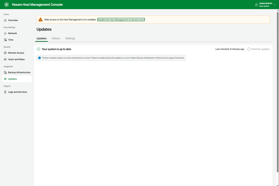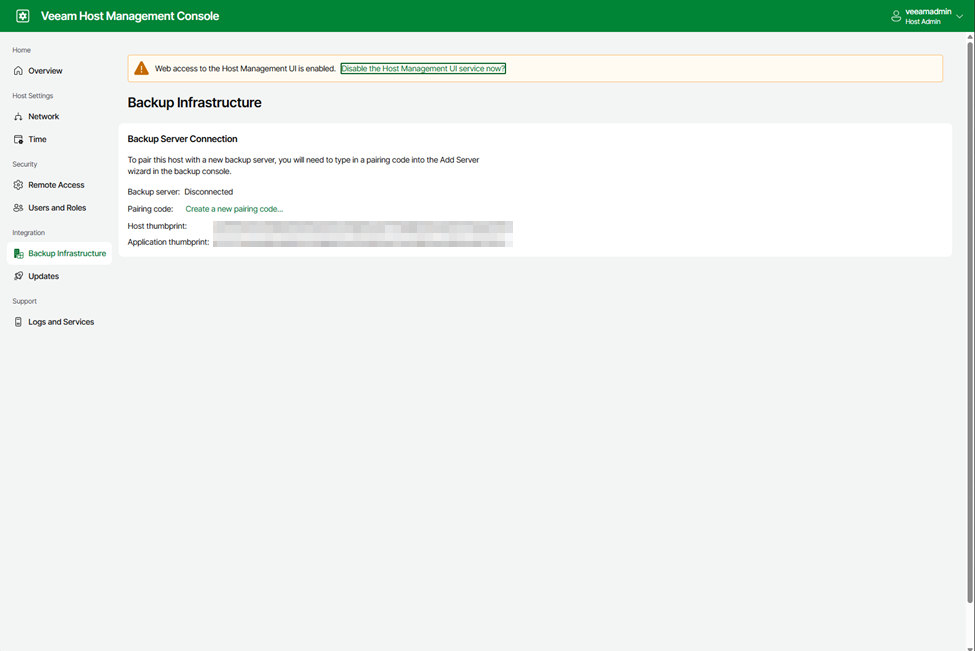 Now that the VHR is deployed, I would recommend visiting the Updates tab to check for any available updates before proceeding any further. Next, add the VHR to your VBR server as a hardened repository. One of my favorite features about VBR v13 is that security is increased by use of certificate-based authentication rather than using preshared usernames and passwords. In the case of the VHR (and any other servers that utilize the VIA deployment) is that after it is deployed, it will wait for a connection from the VBR server to be added automatically without having to provide credentials. Simply verify that the certificate thumbprint presented in VBR when adding the repository server matches the thumbprint display on the Host Management summary at the console or in the web interface under the Backup Infrastructure tab. If for some reason there is an issue, or you want to regenerate the certificate key, you can do so via the Host Management web interface. This would also be where you would need to go if you were wanting to break the link between the VHR and your VBR server if you needed to connect it to a different VBR server for some reason. Note that this is one of the functions that requires four-eyes verification by the Security Officer, however.