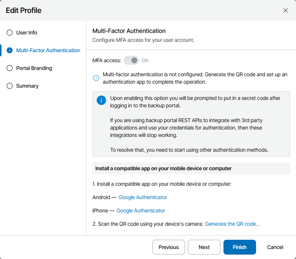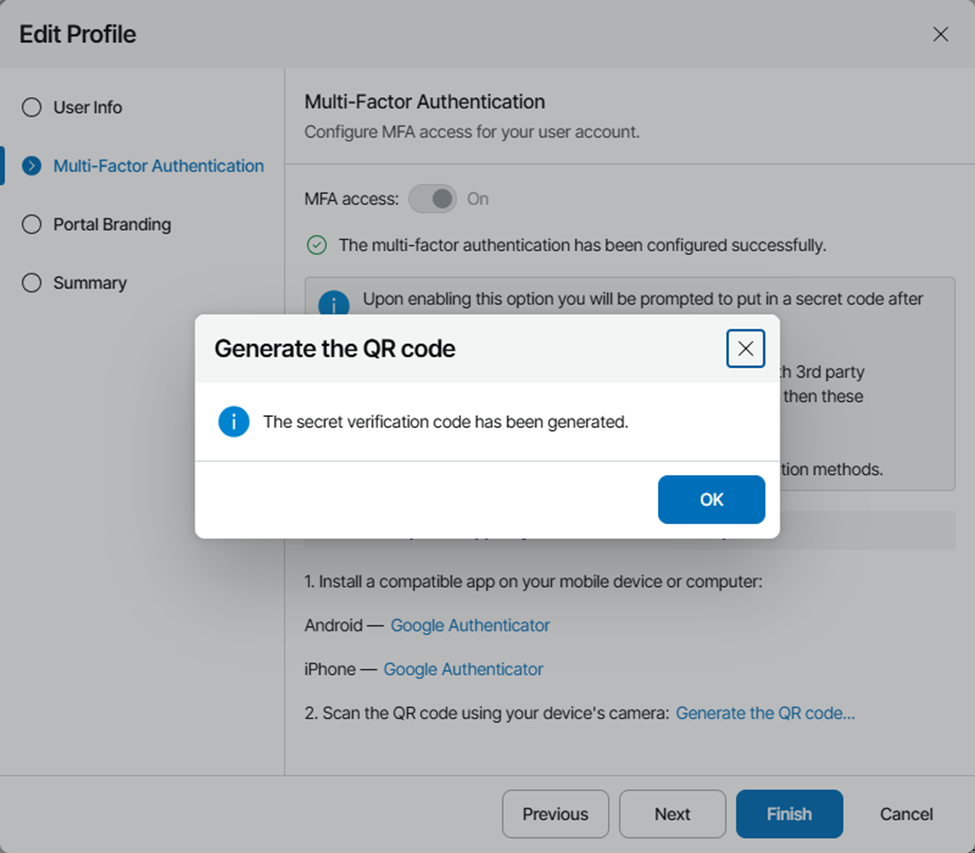 Once you’ve completed the MFA enrollment, walk through the wizard to configure any other profile settings you desire and click finish.