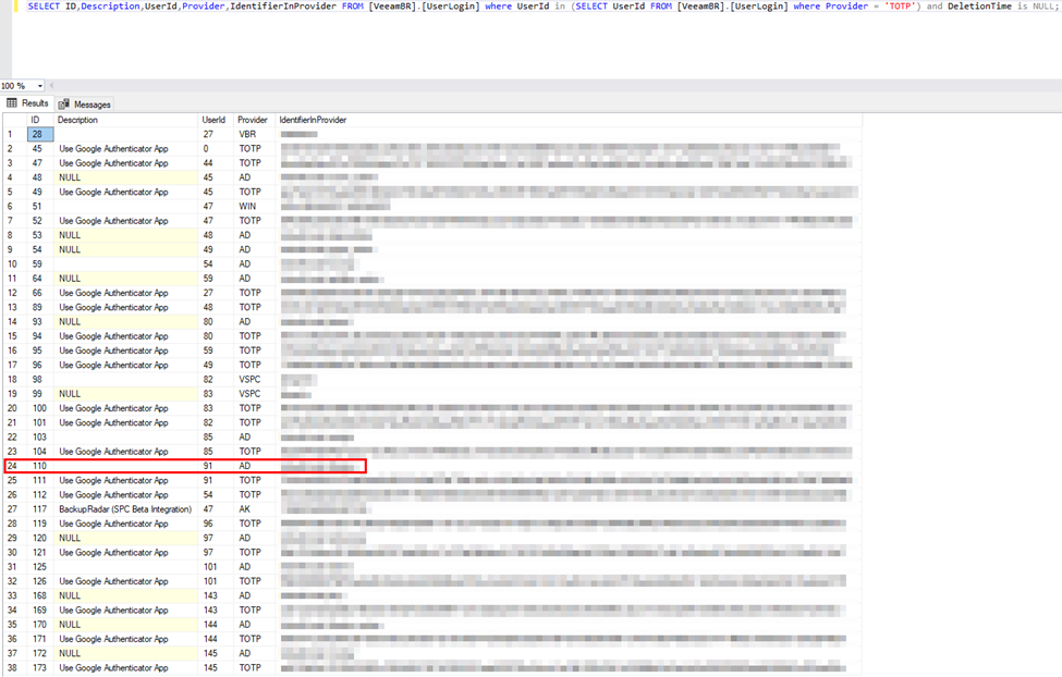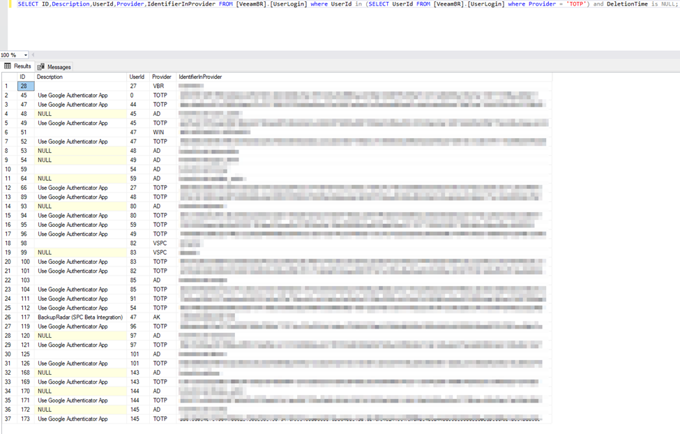 SELECT ID,Description,UserId,Provider,IdentifierInProvider FROM [VeeamBR].[UserLogin] where UserId in (SELECT UserId FROM [VeeamBR].[UserLogin] where Provider = 'TOTP') and DeletionTime is NULL;