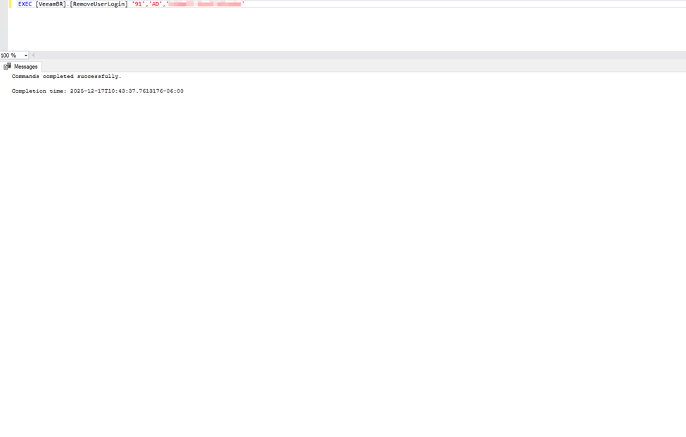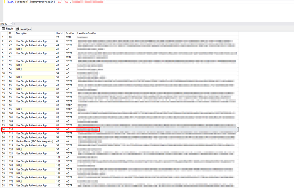 EXEC [VeeamBR].[RemoveUserLogin] 'UserId','Provider','IdentityInProvider'