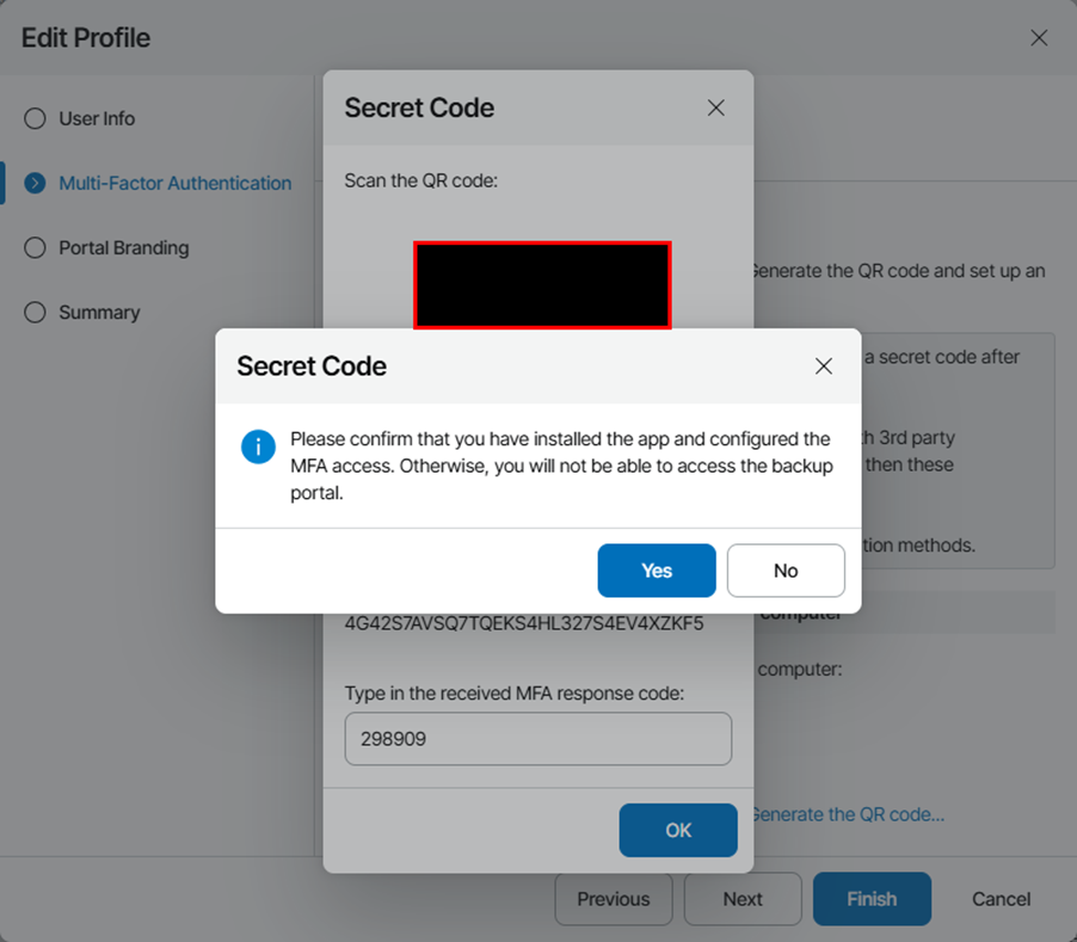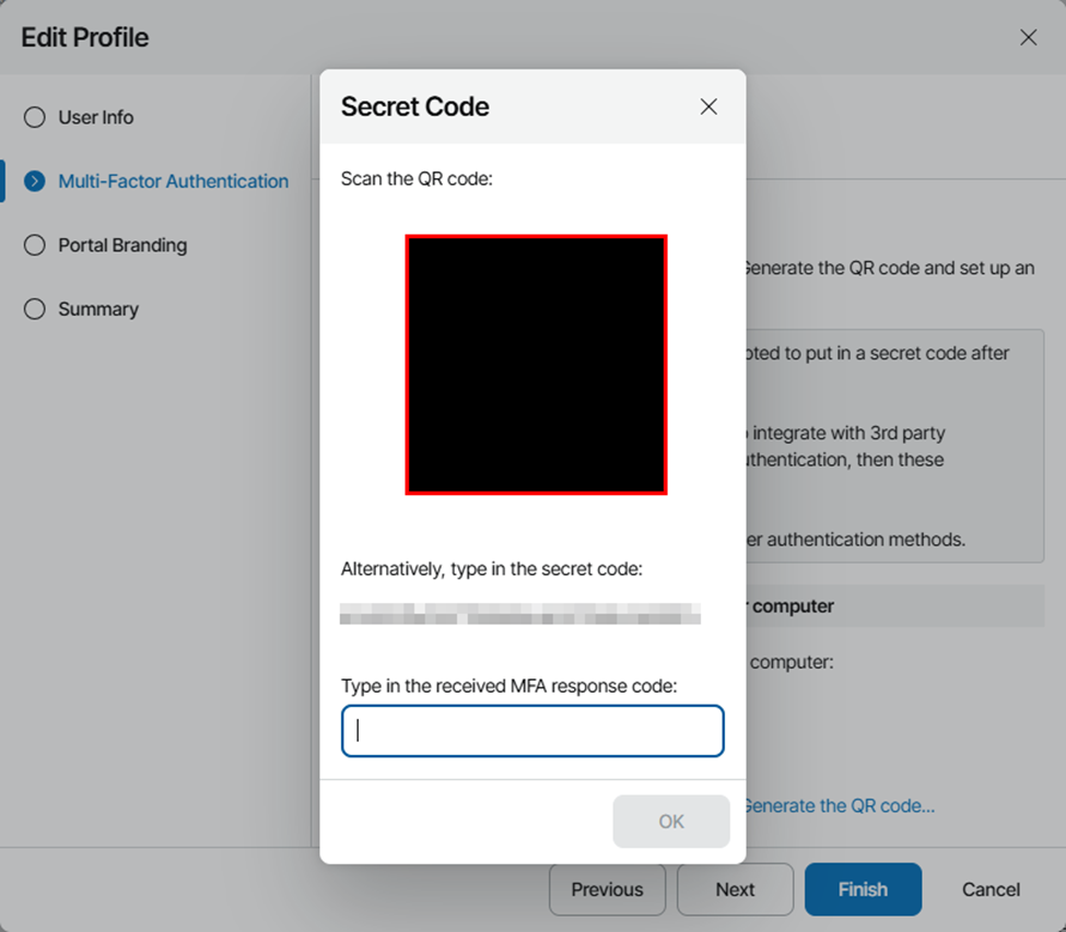 After the service has been restarted, refresh your login page and login with your AD credentials. Once you do so, you should be prompted to enroll in MFA. Select “Generate QR Code” to display a code and generate a secret key, and scan with your MFA app of choice.